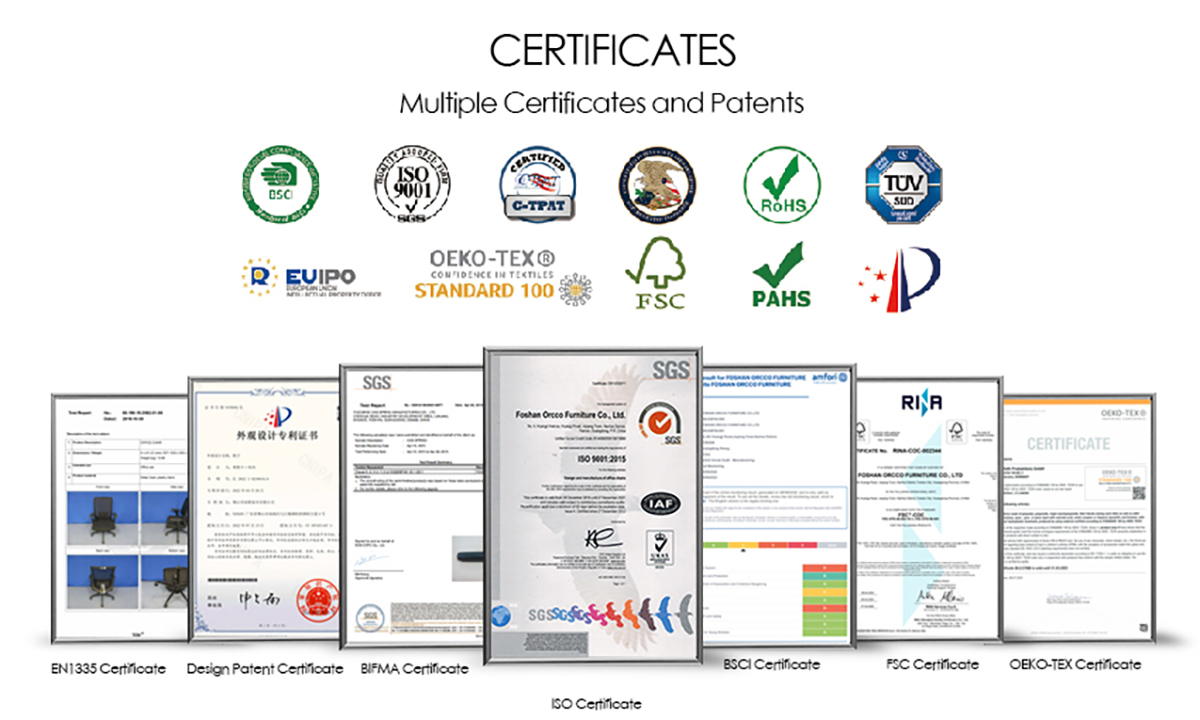 Orcco has passed ISO quality management system certification, BSCI and FSC certification. Products can pass BIFMA, EN1335 test and GRS environmental protection standards, etc.